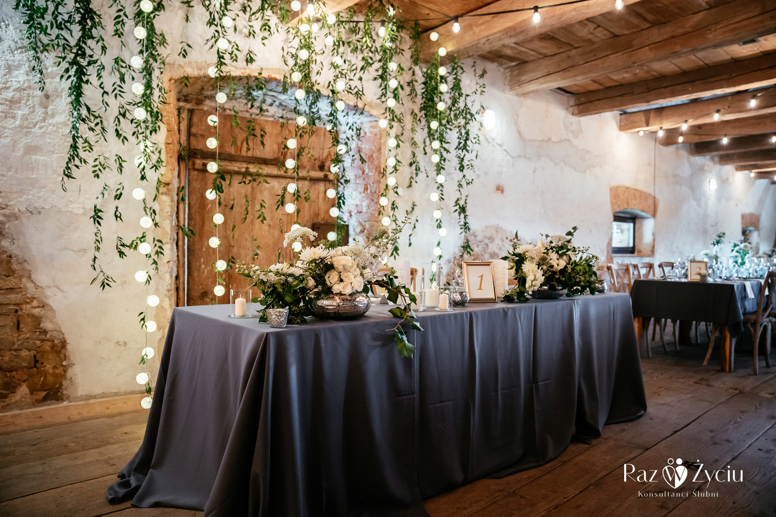 Stół Pary Młodej, tylko dla Dwojga, pięknie prezentował się na tle zabytkowych drzwi, ozdobionych światełkami i zielenią.