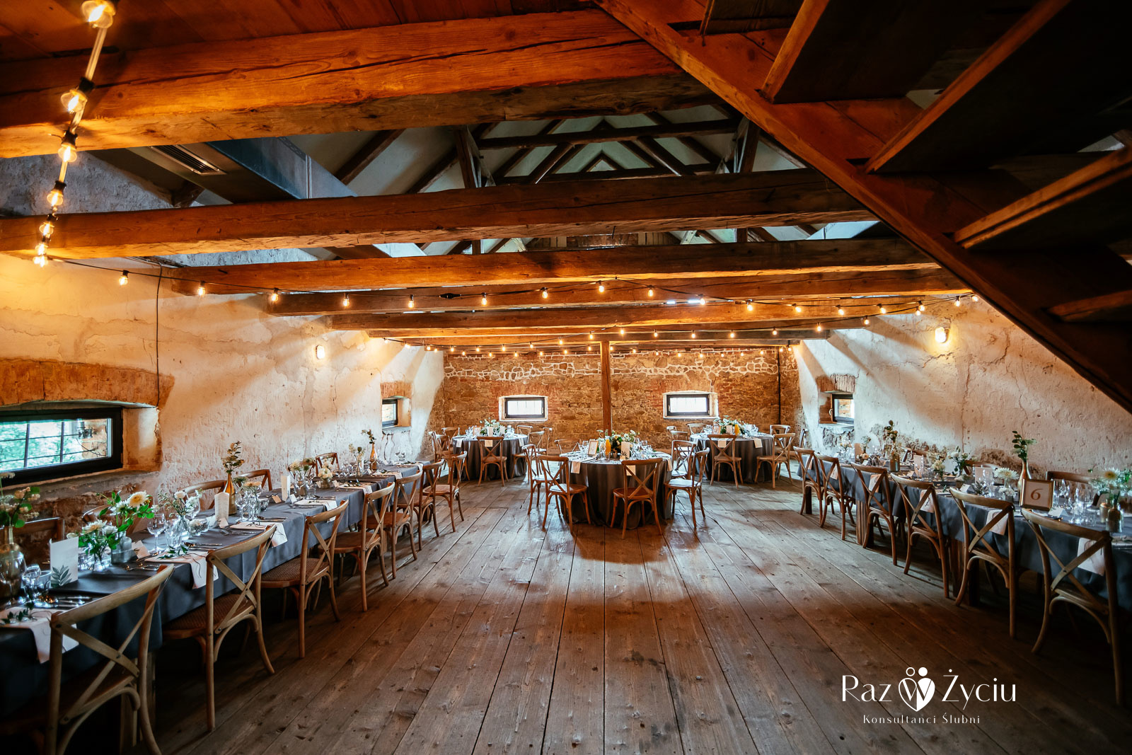 W rustykalnej przestrzeni dominowały eleganckie, stylowe dekoracje. Biel i zieleń w połączeniu z szarymi obrusami oraz złotymi dodatkami.